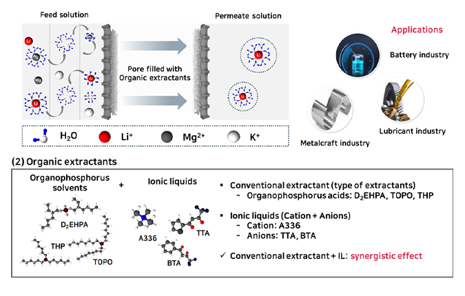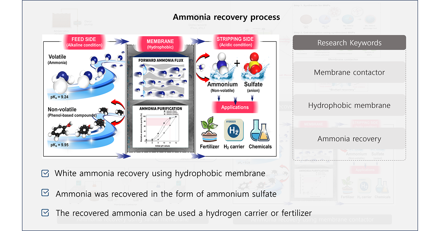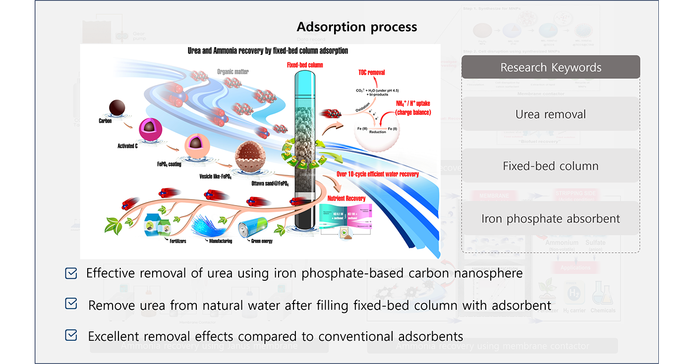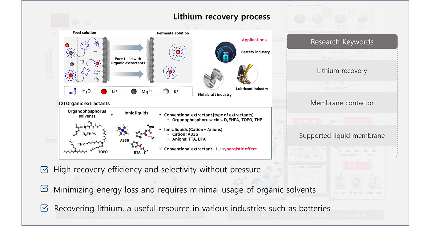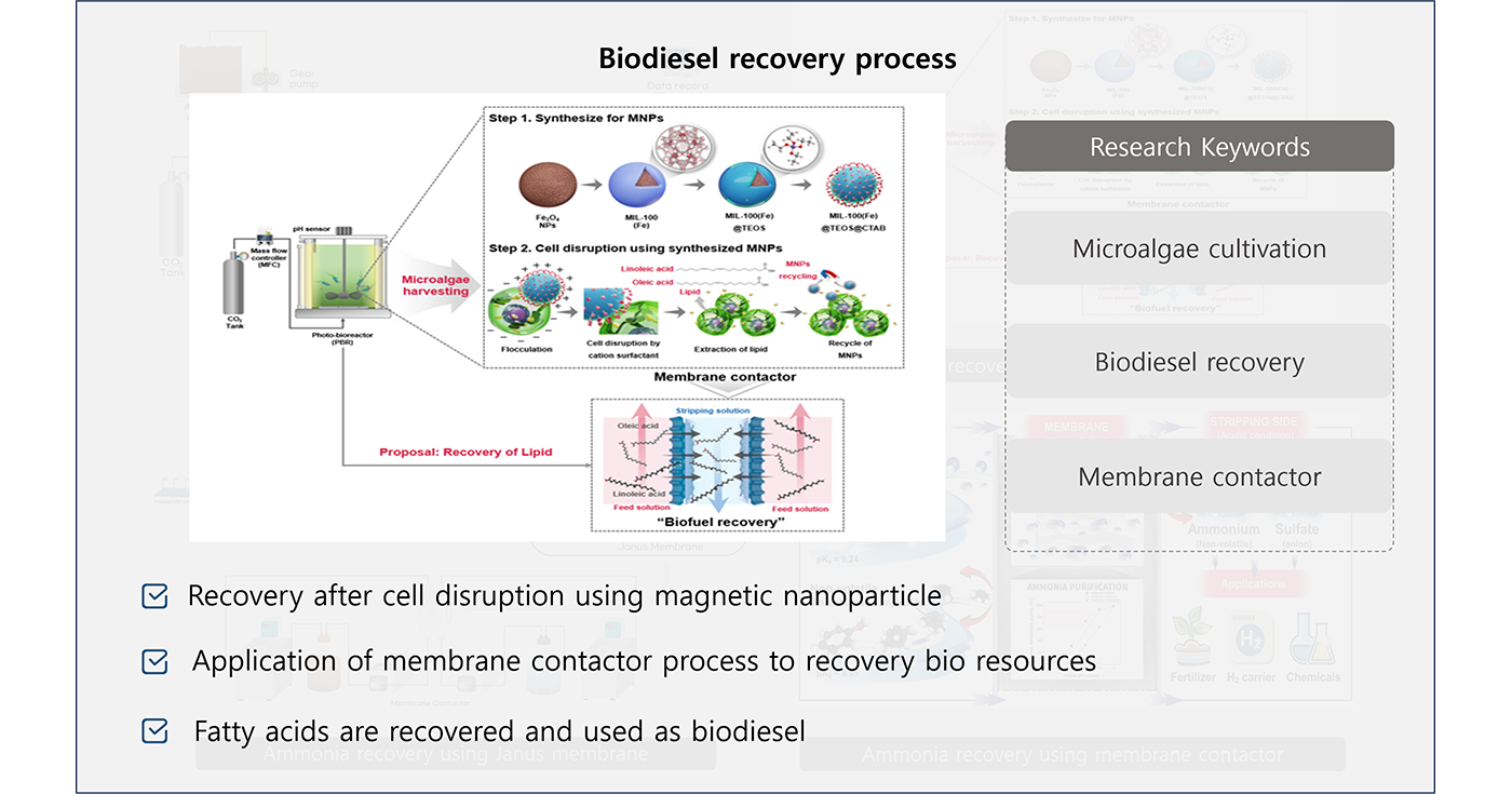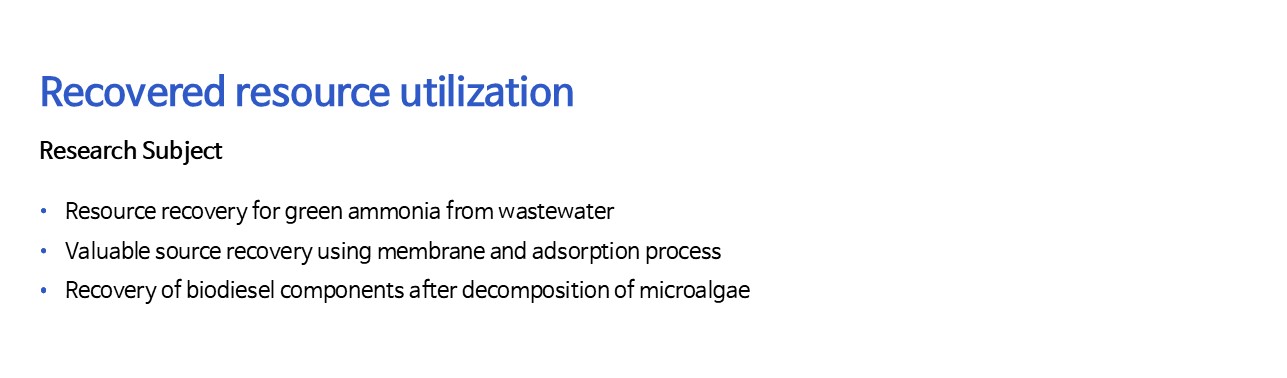 본문 INTEREST Water Reuse Resource Recovery Water Purification 01 Lithium recovery process Membrane extraction utilization Click 02 Ammonia recovery process Hydrophobic membrane contactor Click 03 Adsorption process Utilization of porous adsorbents Click 04 Biodiesel recovery process Utilization of biorefinery technologies Click